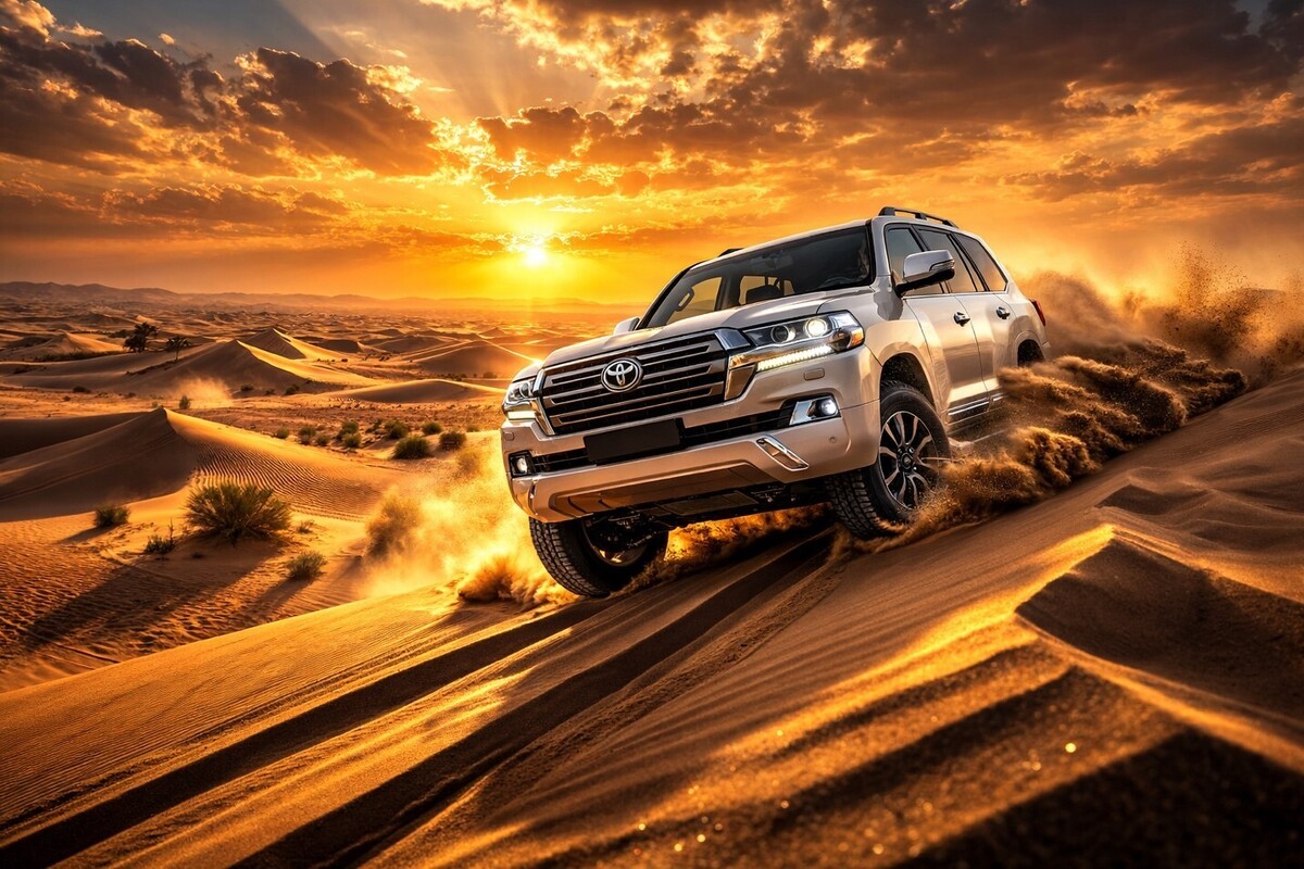 قلب تپنده سافاری دبی همین بخش است. پس از ترانسفر از هتل، رانندگان حرفهای و لایسنسدار با خودروهای شاسیبلند 4x4 (اغلب لندکروزهای مجهز به رولبار ایمنی) شما را به یک سواری پرهیجان روی تپههای شنی روان (Dune Bashing) میبرند. در ادامه، فرصت دارید تا سندبوردینگ (اسکی روی شن) را نیز امتحان کنید و آدرنالین خونتان را به اوج برسانید.